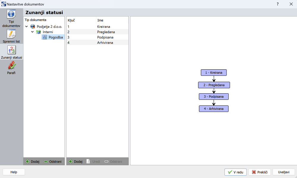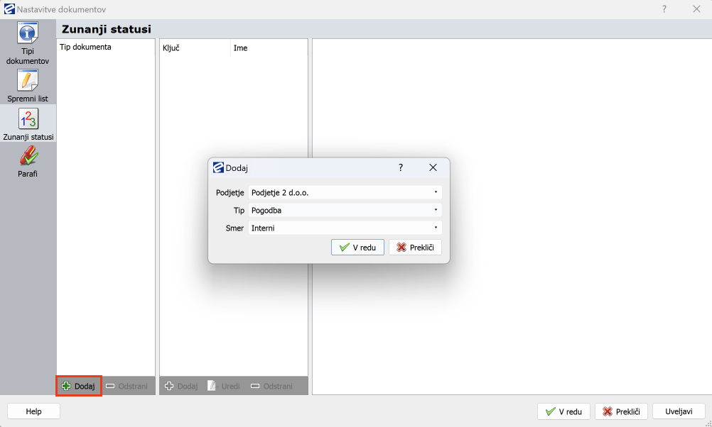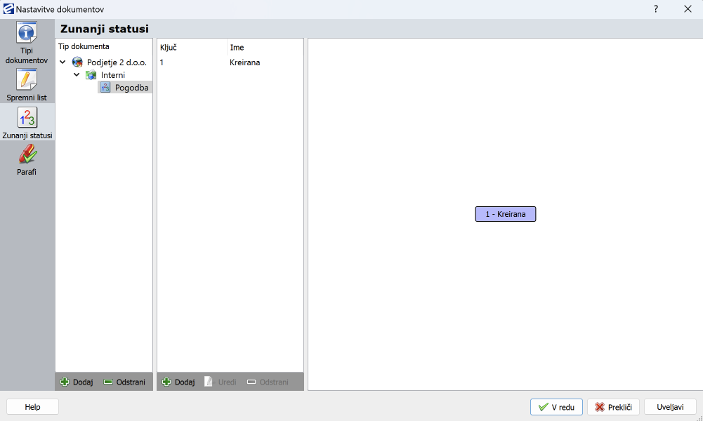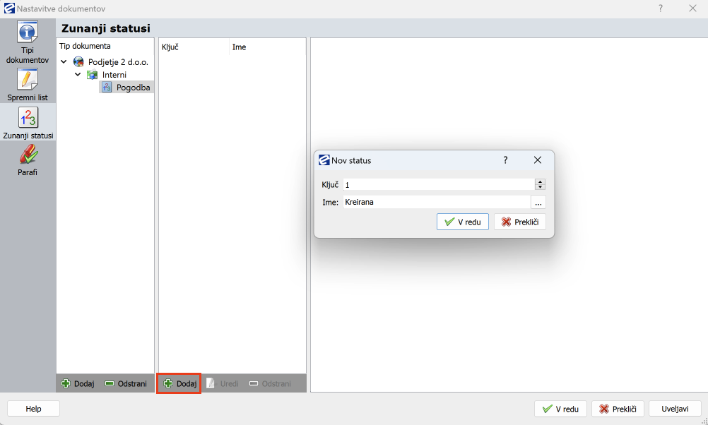 Dodan je tip dokumenta, ki mu sedaj lahko dodelite zunanje statuse. Označite tip dokumenta (v našem primeru je to Pogodba). S klikom na gumb gumb dodaj v sredinskem delu okna dodajate ključ in ime zunanjega statusa.