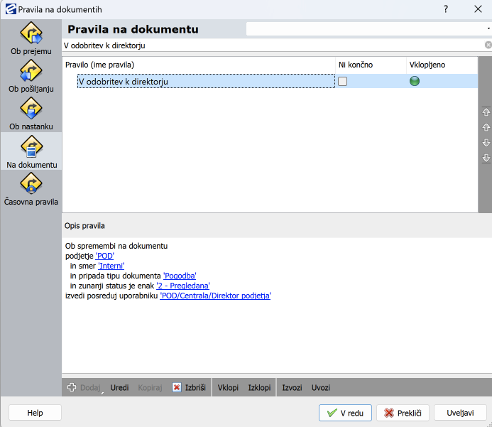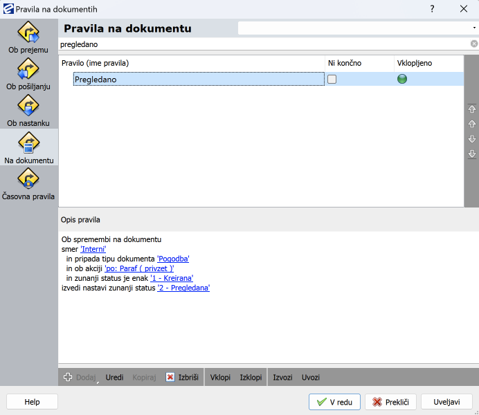 V drugem pravilu pa se uporablja zunanji status kot pogoj, ki mora biti izpolnjen, da se akcija izvede. Samo, če je dokument v statusu Pregledana, gre v odobritev k direktorju.