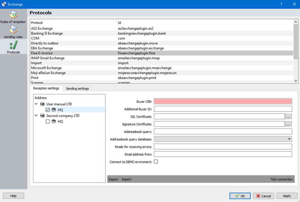 After activation you can set mandatory data for exchange. Head to Administration>Exchange>Protocols menu and select FINA E-invoice from exchange list: