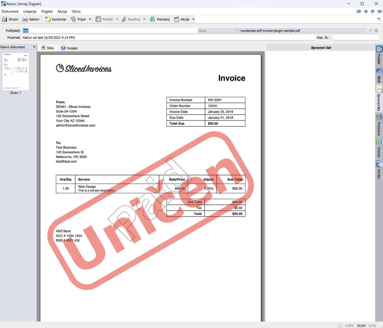 Dokument dobi uničen vodni znak in status Uničen. Uničenje lahko prekličete z akcijo “Prekliči uničenje”.