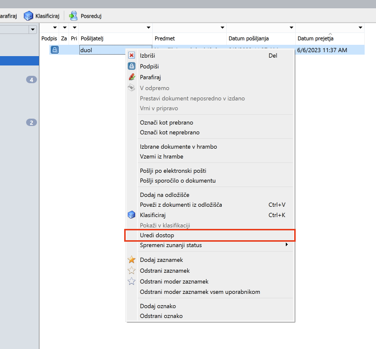 - Izvedba dejanja “Uredi dostop” v podoknu s seznamom dokumentov, kjer lahko dodelite ali prekličete dostop (glejte sliko).