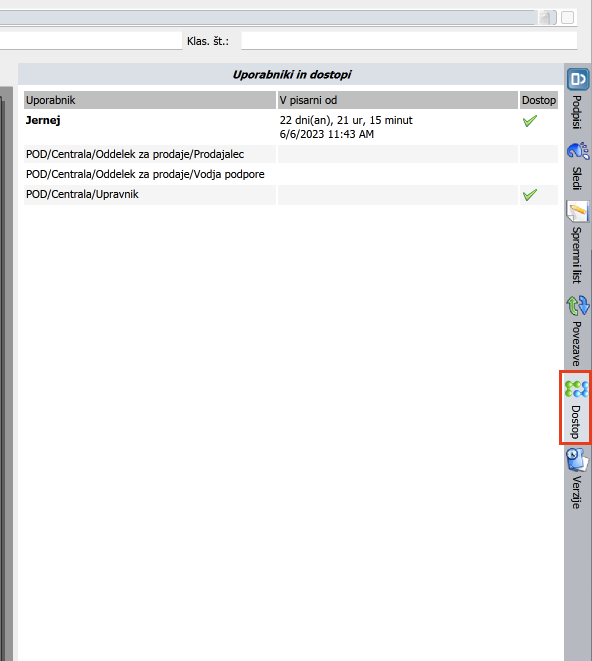 - Dostop do dokumenta je omogočen vsem uporabnikom na delovnem mestu ob predložitvi dokumenta temu delovnemu mestu ali posameznim uporabnikom na tem delovnem mestu (akcija Posreduj).
