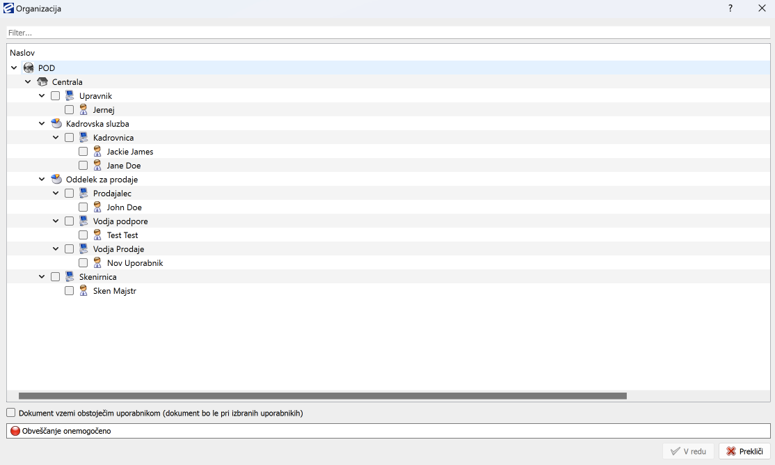 Če uporabnik, ki mu želite posredovati dokument, ni pooblaščen za to vrsto dokumenta, ne bo viden v organizacijski shemi za posredovanje.