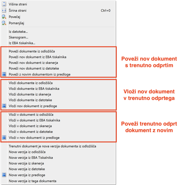 Poveže dokument(e) iz odložišča s trenutno odprtim dokumentom. - Poveži nov dokument iz EBA tiskalnika