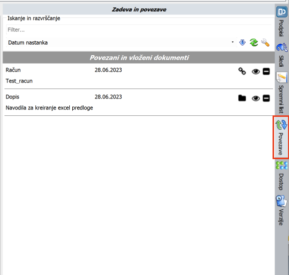 Najlažje dva dokumenta povežete tako, da v seznamu dokumentov (v pisarni ali nadzoru) pritisnete kombinacijo tipk ctrl+c na dokumentu, ki ga želite povezati, in ctrl+v na dokumentu, ki ga želite povezati.