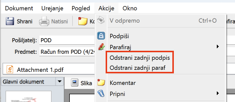 Če želite odstraniti podpis ali paraf, odprite dokument in v meniju Akcije izberite akcijo “Odstrani zadnji podpis” ali “Odstrani zadnji paraf”: