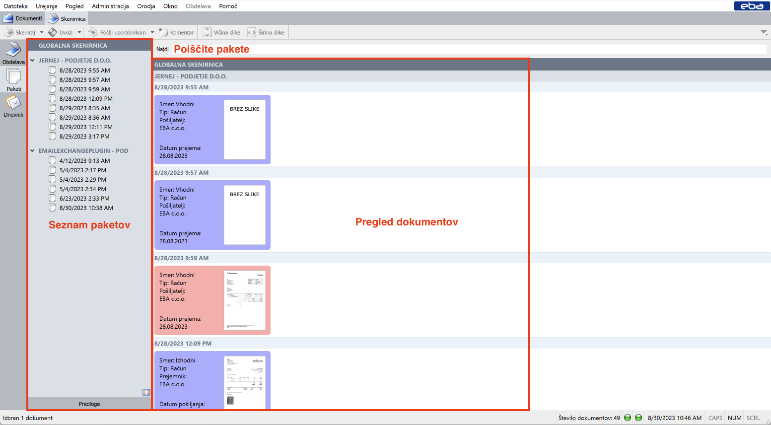 Vsak zajeti dokument v sistemu EBA DMS gre v modul Skenirnica kot paket, ne glede na vir.