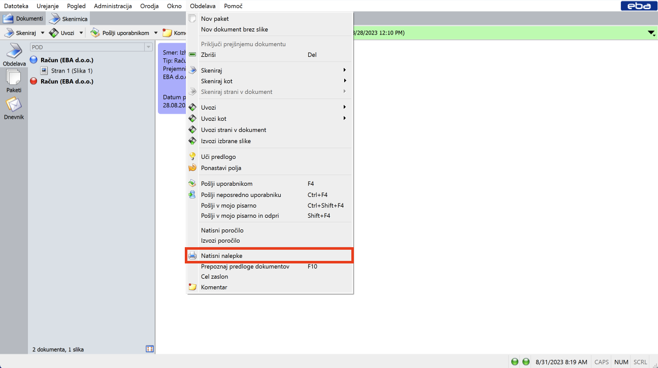 Če želite natisniti nalepke, pojdite v modul Skenirnica in v meniju Proces izberite akcijo Natisni nalepke.