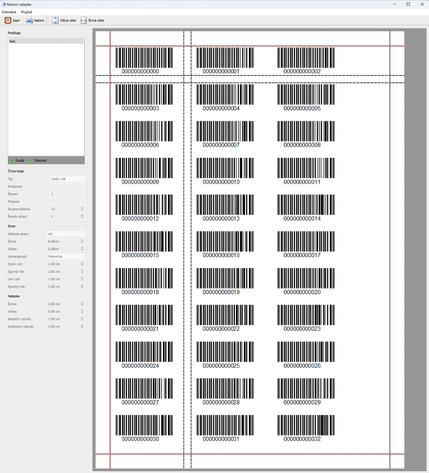 EBA DMS ima možnost tiskanja nalepk s črtno kodo. Določite lahko različne vrste črtnih kod, nastavite dimenzije itd.